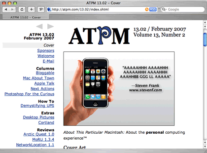 The ATPM Web site as it normally appears on my screen. At my normal screen resolution of 1440×900 my chosen browser window size fills about a quarter of my screen. At 800×600 it fills the entire screen. In these screenshots you may notice a button labelled 1P. It belongs to a utility called 1Password that makes it easy to fill in forms.